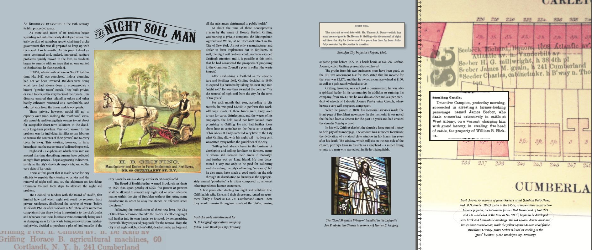 One of those merchants featured prominently in the founding of the Lafayette Avenue Presbytery Church. Before this, however, he had begun his interesting career as a Night Soil Man – starting a company which, amongst other “agricultural” endeavors, collected human excrement from the backyard privvies of Brooklyn, selling this “compost” to Long Island farmers as the appropriately – if euphemistically – named “poudrette.”