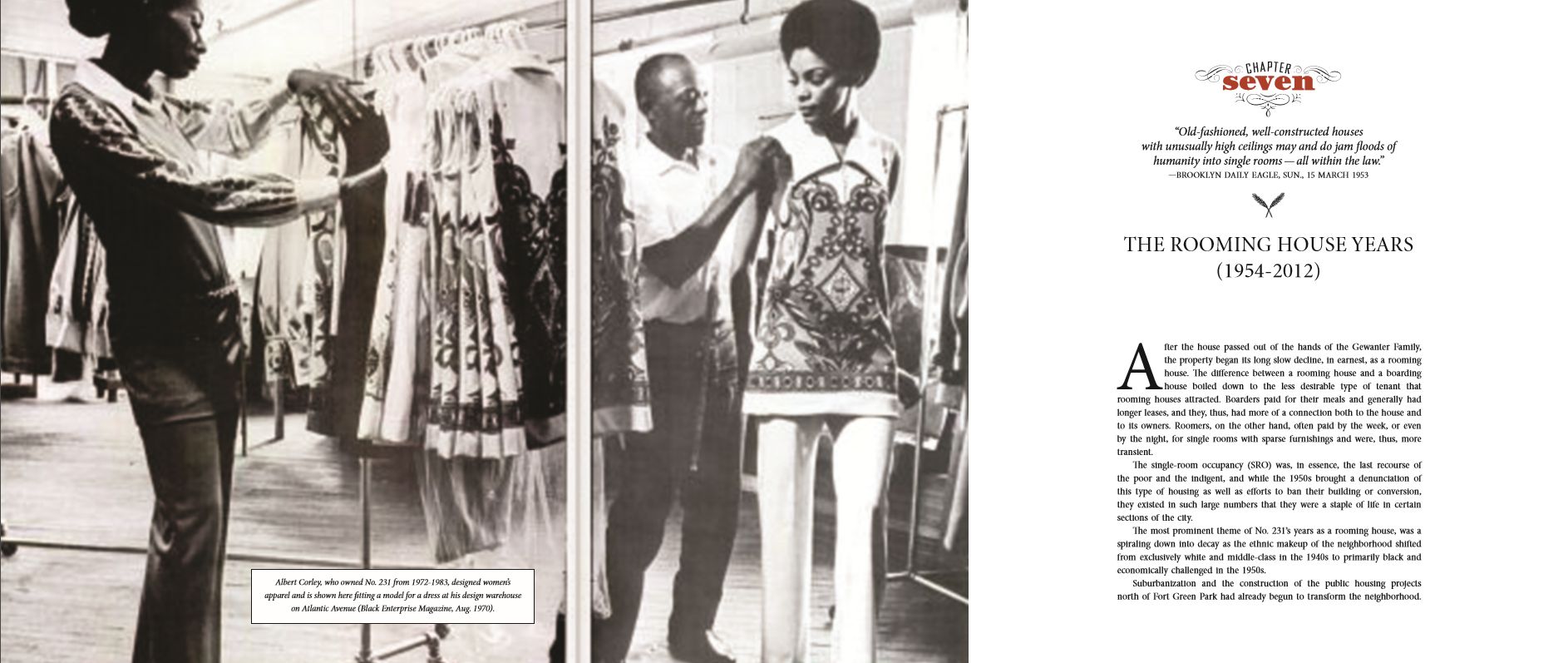 In 1971, however, Albert Corley, a WWII veteran who worked his way up from trundling racks of dresses in the fashion district in the 1950s to owning his production line, created a a dress design and manufacturing company with a grant from the Bedford-Stuyvesant Restoration Corporation. After successes in the industry, he moved away in the ’80s, conveying the house onto its next owner.