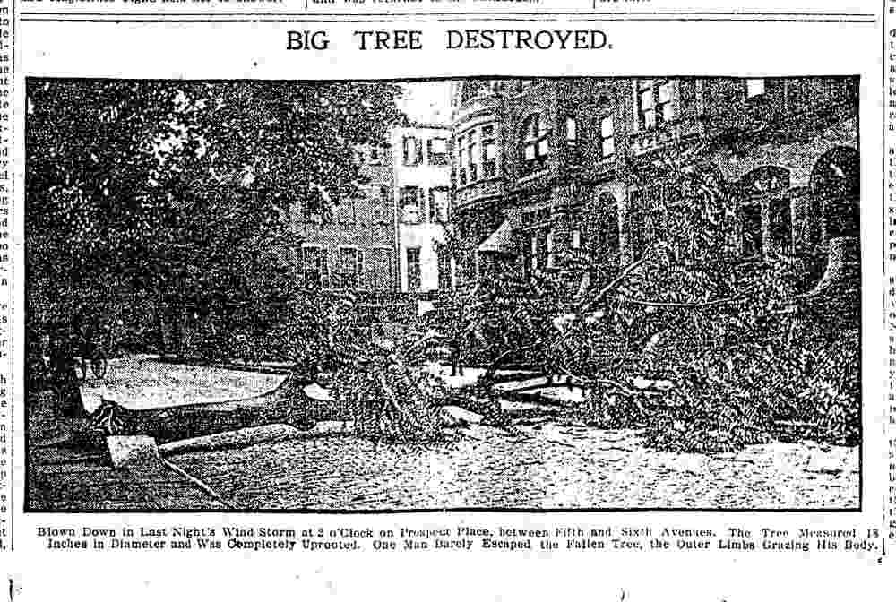 One of those fallen trees crossed Prospect Place between 5th and 6th Avenues. One man “barely escaped the fallen tree, with the outer limbs grazing his body.”