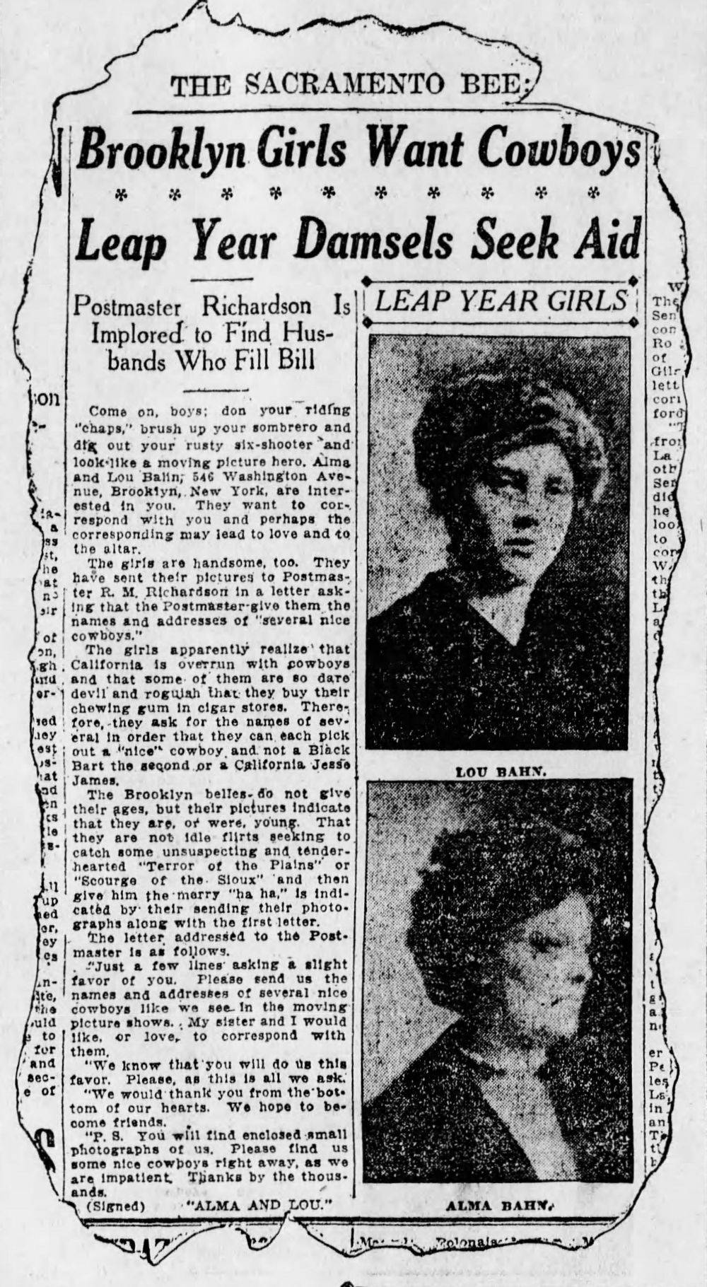 So started the article in the Sacramento Bee in April of 1912 about two Brooklyn sisters who were looking far afield for long-distance leap year affairs.