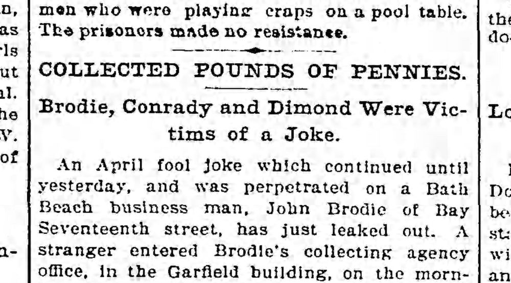 The following day, however, after Brodie had realized the April Fool’s joke played at his expense, he plotted to get his money back, returning first to Moloughney’s store and telling the storekeeper that he no longer wanted the pennies. Moloughney, however, refused to give Brodie his money back.