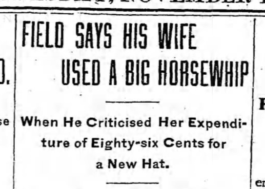 “Saturday night I gave my wife $8 to buy her a hat,” attested Mr. Field. “She told me that she was going to buy it at one store, but the ticket showed that she had gone to another place and bought a hat frame for 19 cents and a silver buckle for 67 cents. When I found this out I accused her of again deceiving me. Then she flew into a rage and, with a horsewhip and gave me a terrible beating about the body.