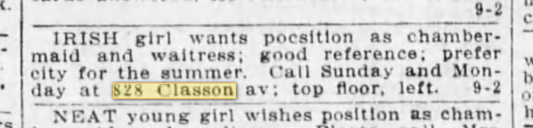 828 Classon Avenue – In 1915, an “Irish Girl,” who lived at No. 828, was seeking a “position as chambermaid and waitress.” Advertising your nationality in a nation of immigrants was important at the time as many of these 1st and 2nd generation immigrant homeowners tended, in most cases, to trust those whose ethnic backgrounds they understood.