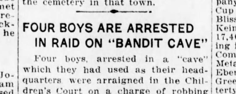 (What a seriously cool clubhouse to have had! Considering, though, that much of that area was being built up around the time, where in the neighborhood might this “cave” have been?)