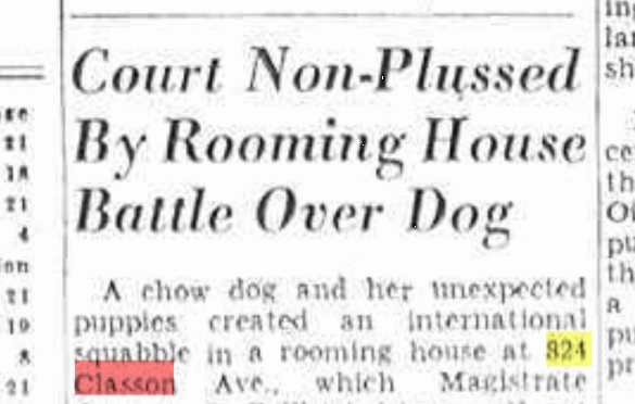 In 1939, “an international squabble in a rooming house at 824 Classon Ave.,” was fought over a “chow dog.”