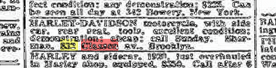 In 1921, a man by the name of “Sherman” was selling his “Harley-Davidson motorcycle, with side car, rear seat, tools.” The bike was in excellent condition,” and Sherman was offering a “demonstration” and selling the motorcycle for “cheap.” He asked that those interested “call Sunday” at “832 Classon av.”