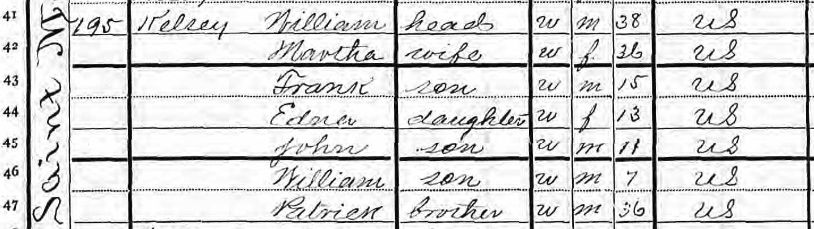 According to this document, William worked for the “street railway” and lived with his wife, Martha, three sons, Frank, John, and William, a daughter, Edna, and a brother, Patrick (who also worked for the “street railway”).