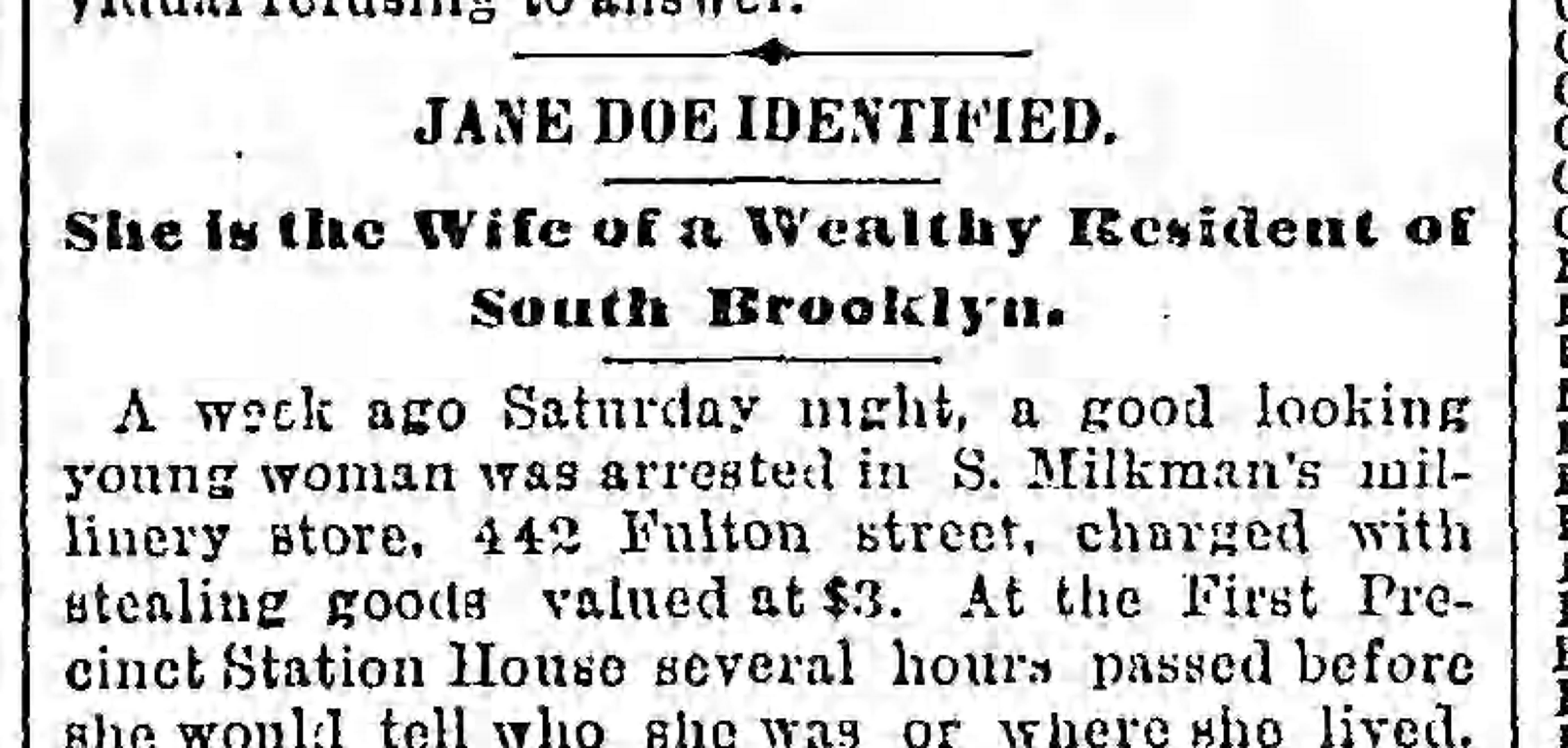 In 1890, the first of Milkman’s thieves made the morning papers when a wealthy South Brooklyn woman was caught red-handed, so to speak, stealing goods valued at $3.