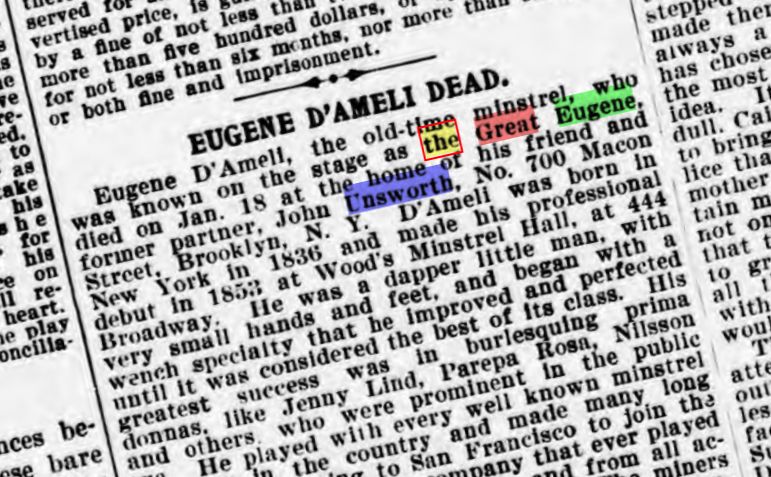 His partner, “Johnny” Unsworth, of 700 Macon Street, recalled Eugene’s beginnings in the minstrel theatre.