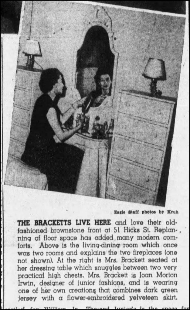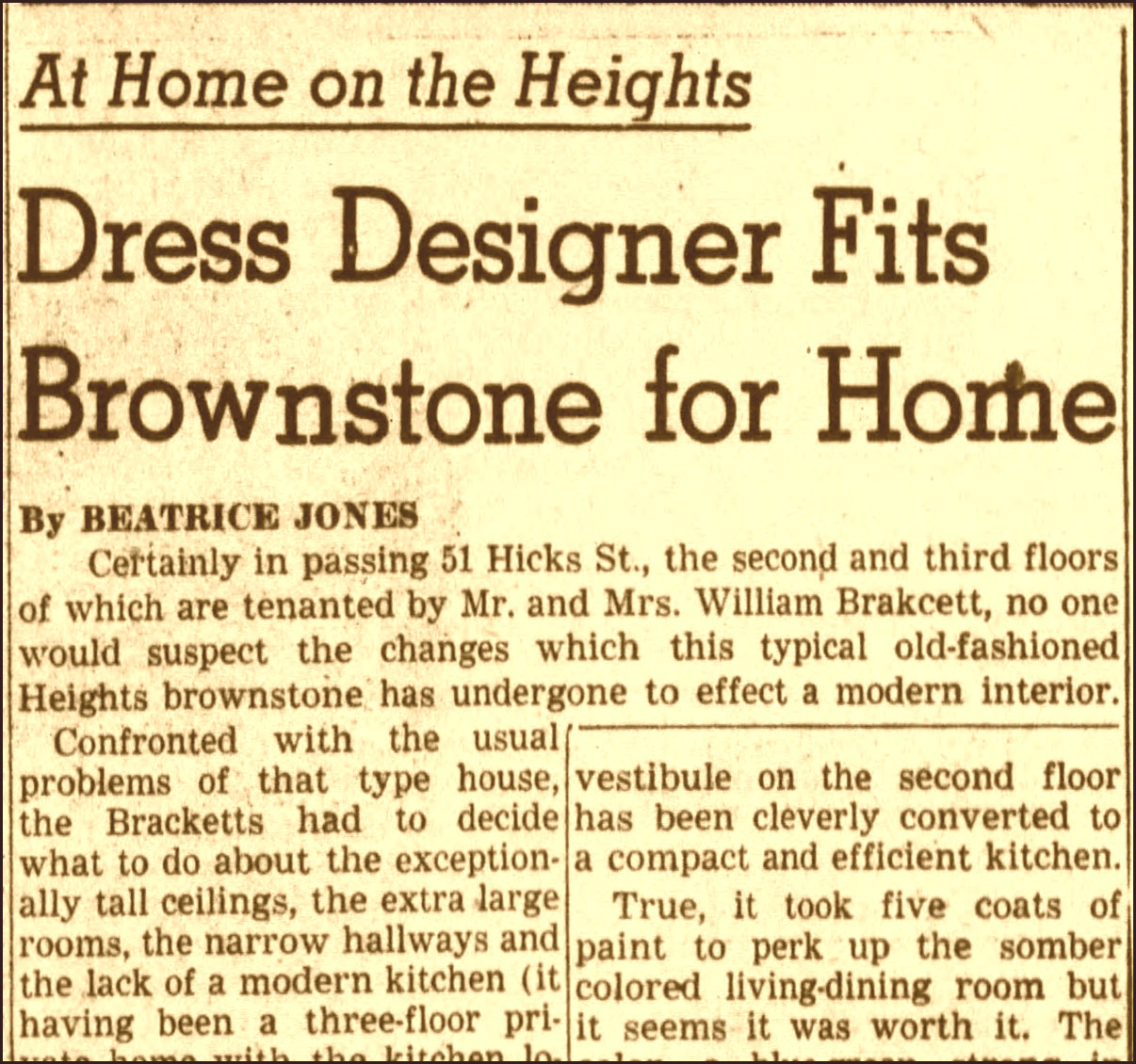 Ed.’s Note – The residents of Brooklyn Heights were the first in the borough to see old brownstones as treasures to be valued. In the 1930s and 1940s, as some were reparting to the suburbs, others were taking advantage of the availability of old brownstones at bargain basements prices. One such homebuyer was a dress designer and her husband who moved into No. 51 Hicks Street and modernized it.